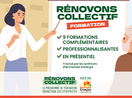 Le programme “Rénovons collectif” vise à sensibiliser, informer et former afin de massifier la demande en rénovation énergétique des copropriétés en France. Il développe diverses actions à destination des copropriétaires mais aussi des syndics et des professionnels du secteur. En parallèle, il outille 57 collectivités partenaires, présentes sur tout le territoire national, pour qu’elles puissent mener diverses actions d’information auprès de presque 93 000 copropriétés, avec une sensibilisation plus large de près de 25 millions d’habitants de leurs territoires soit 1/3 de la population française. En savoir plus sur Rénovons Collectif (lien externe)