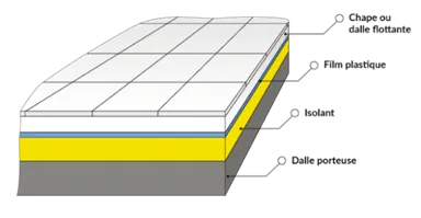 La dalle flottante est une dalle de béton posée sur un isolant thermique sous forme de panneaux rigides. Elle est dite « flottante » car elle est n’est pas intégrée au sol d’origine, elle est posée par-dessus.