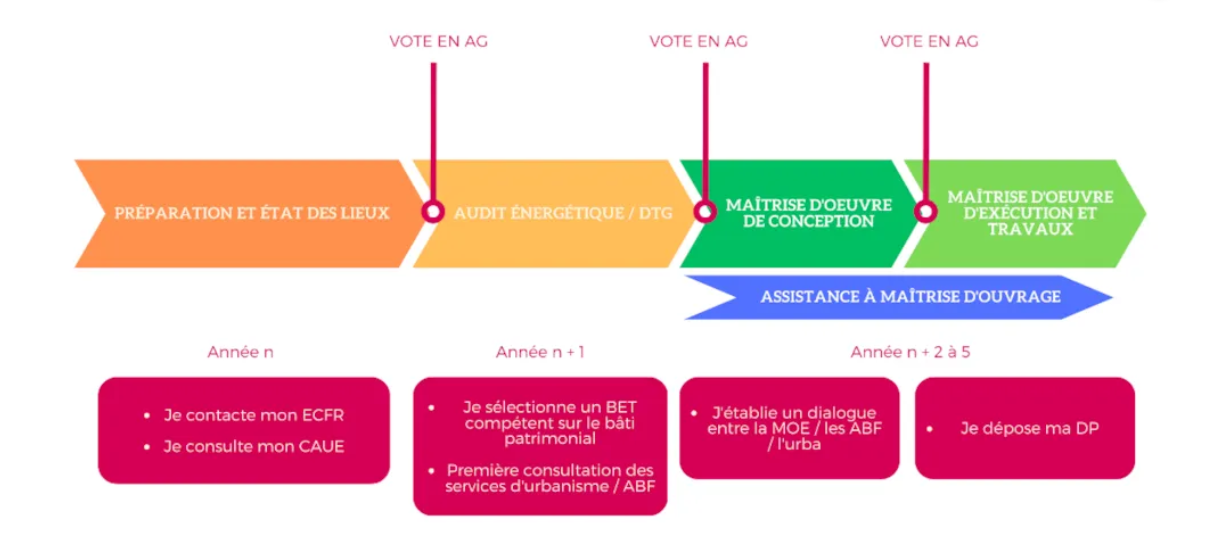 En copropriété, la nécessité d’une communication bien menée et la temporalité des prises de décision rend la durée des projets relativement longue. C’est pourquoi il est primordial d’intégrer la dimension architecturale et patrimoniale très tôt dans la conception du projet. Une prise en compte tardive de ces contraintes pourrait faire prendre un retard important au projet et générer des surcoûts non prévus au budget pour répondre aux prescriptions.