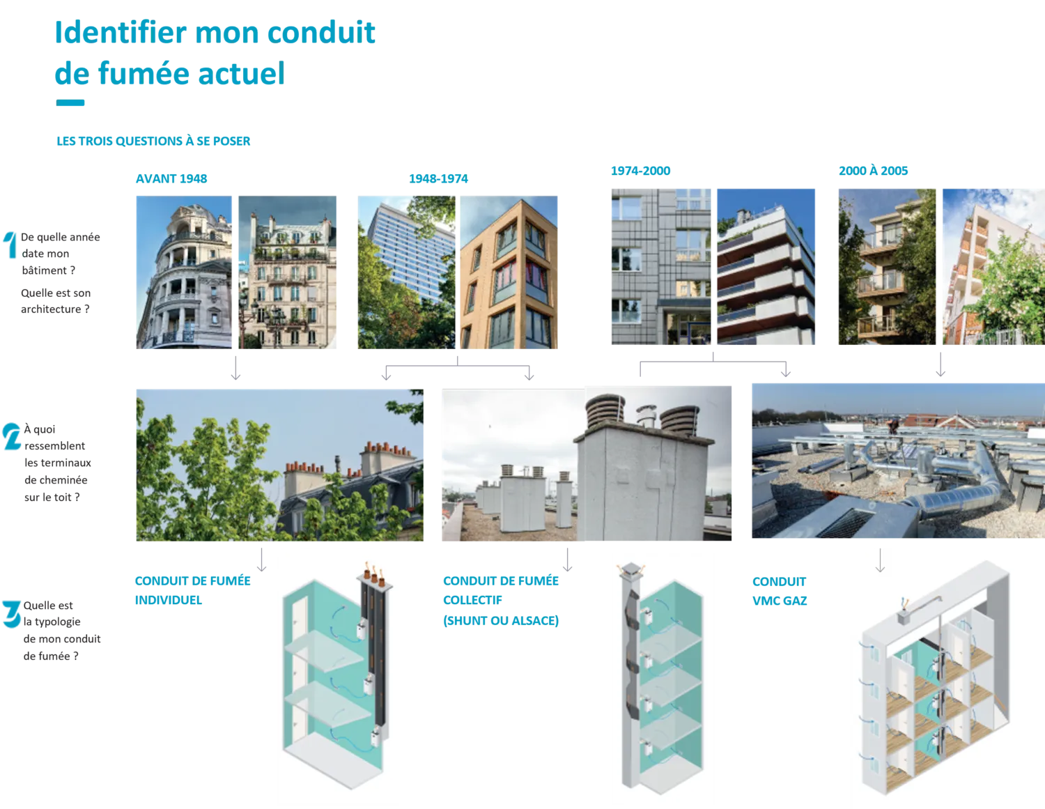 Tout d’abord, il est nécessaire de connaître le type de conduit de fumée dont est équipé votre logement. Pour cela, CEGIBAT, avec l’appui de GRDF, mettent à disposition l’outil Audit conduit en logements | Cegibat. Pour une première approche, ce graphique présente les principaux types existants :