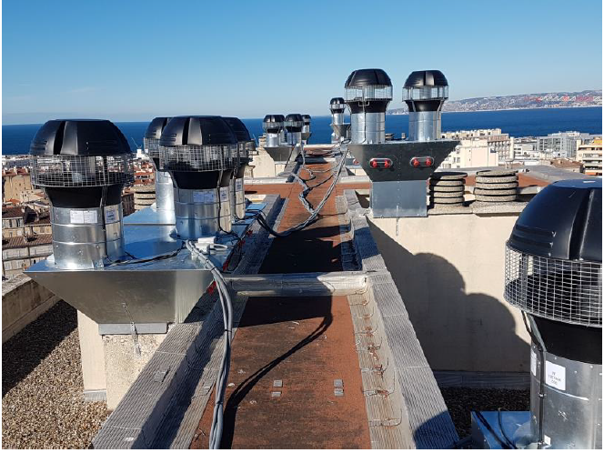 Le système de ventilation hybride est constitué d’une tourelle qui va assister le tirage thermique naturel en permanence. L’assistance au tirage thermique fonctionne avec des moteurs électriques de petite puissance.