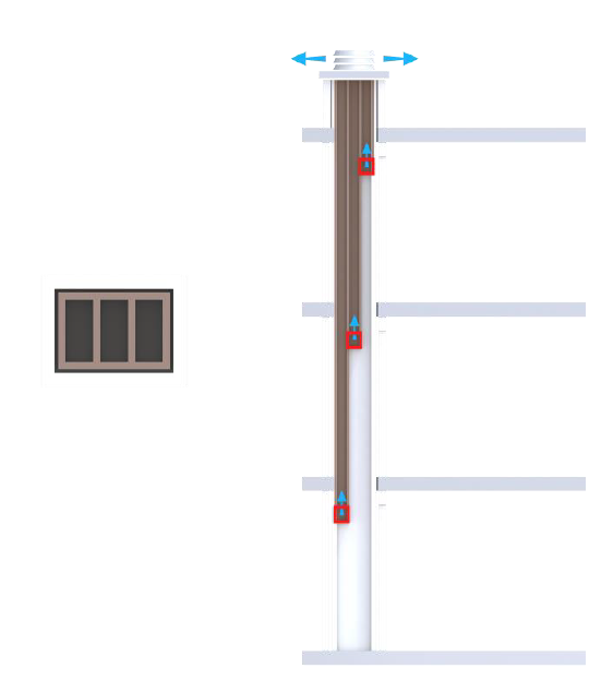 Cette tourelle est positionnée sur les souches au niveau de la toiture, au-dessus d’un boîtier métallique appelé « plénum de recouvrement ». Ce boîtier fonctionne comme une chambre de décantation qui permet d’équilibrer la ventilation sur tous les conduits. Il s’agit d’une pièce de jonction entre le conduit et la tourelle.