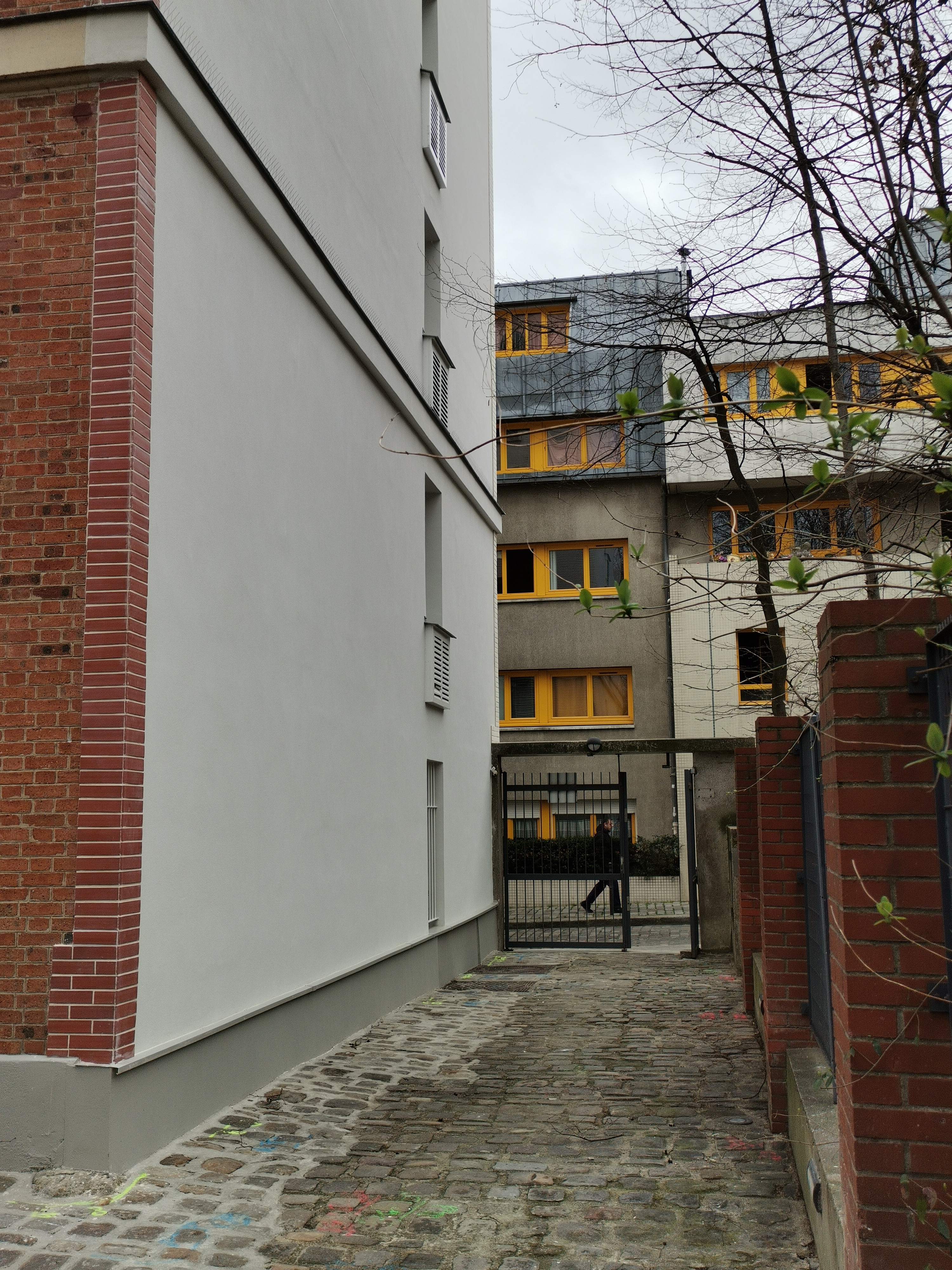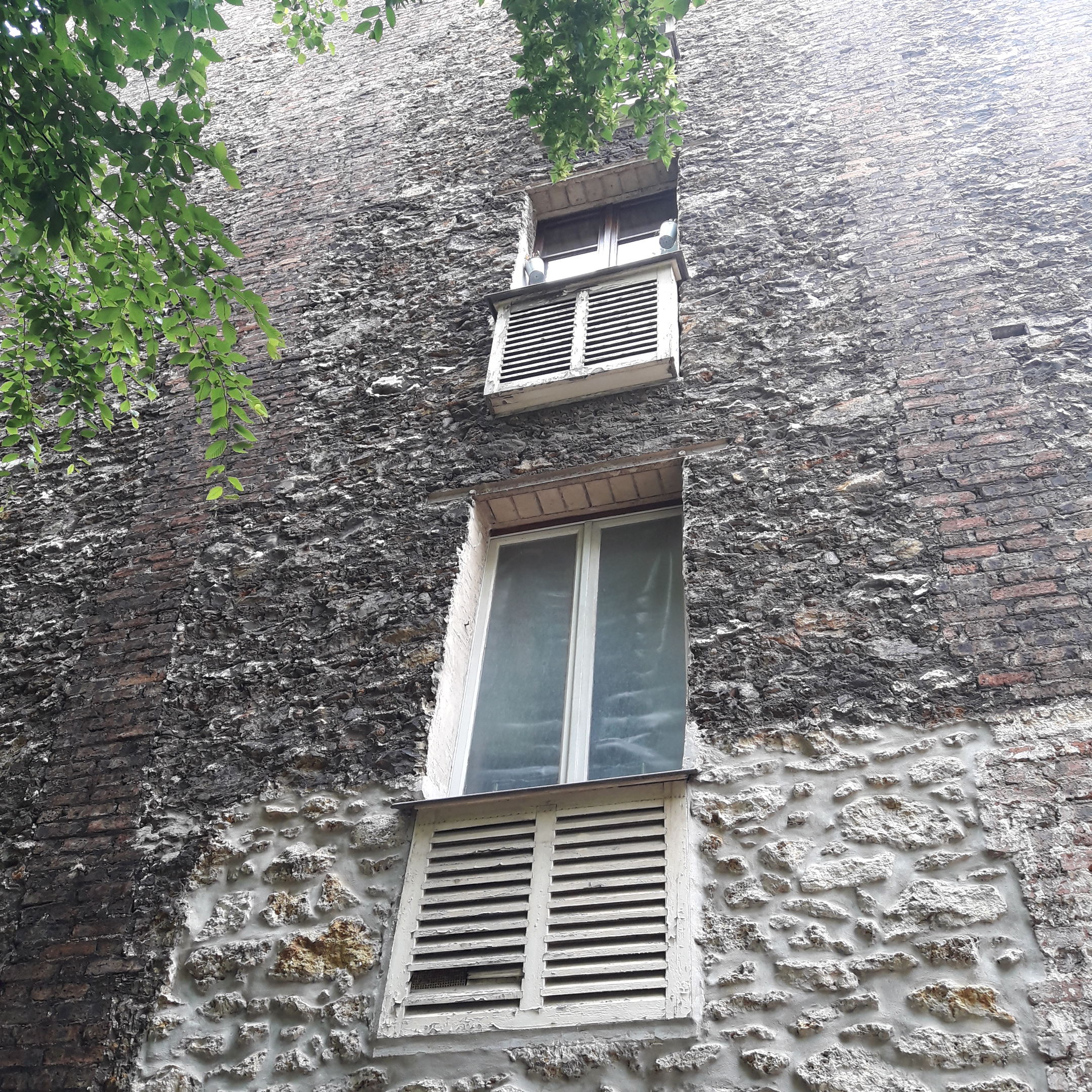 Le pignon est fini en enduit clair au silicate, avec des briquettes d'angle. La création d'un bandeau en laine de roche sur le pignon - assurant aussi un recoupement coupe-feu - assure la continuité visuelle entre les façades sur rue et sur cour. Certains copropriétaires ont remplacé leur menuiseries extérieures dans le cadre des travaux commun, en bois double vitrage.