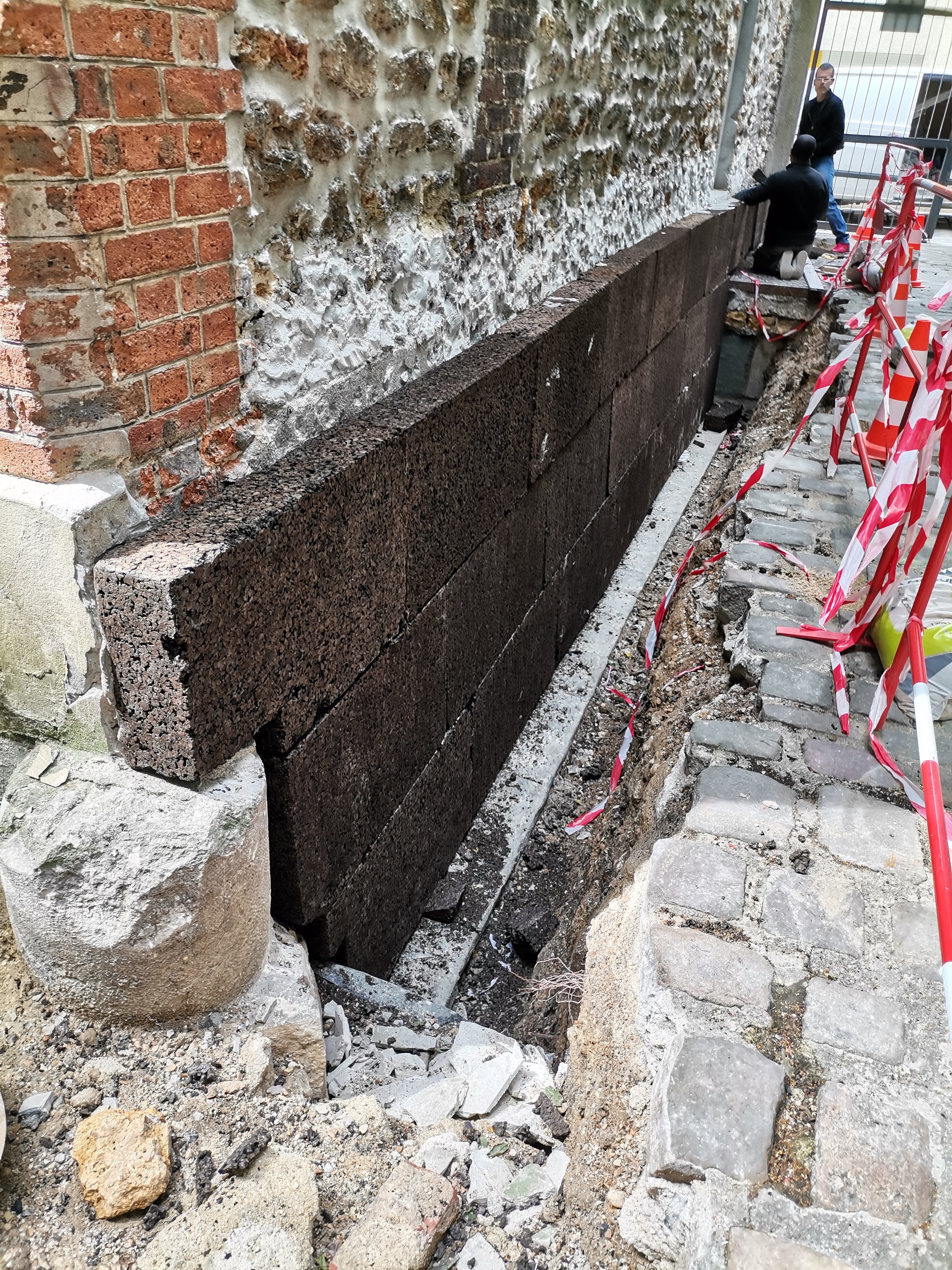 La partie enterrée du pignon est étanchéifiée, puis isolée en liège de 15cm, protégé par un enduit minéral. La création d'un drain et une inversion de la pente des pavés sur le passage protègent le pignon des infiltrations.