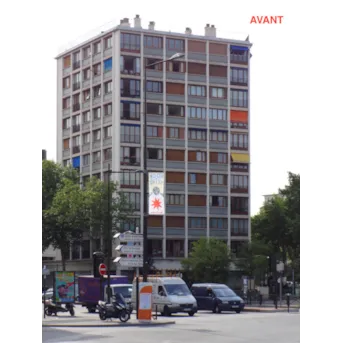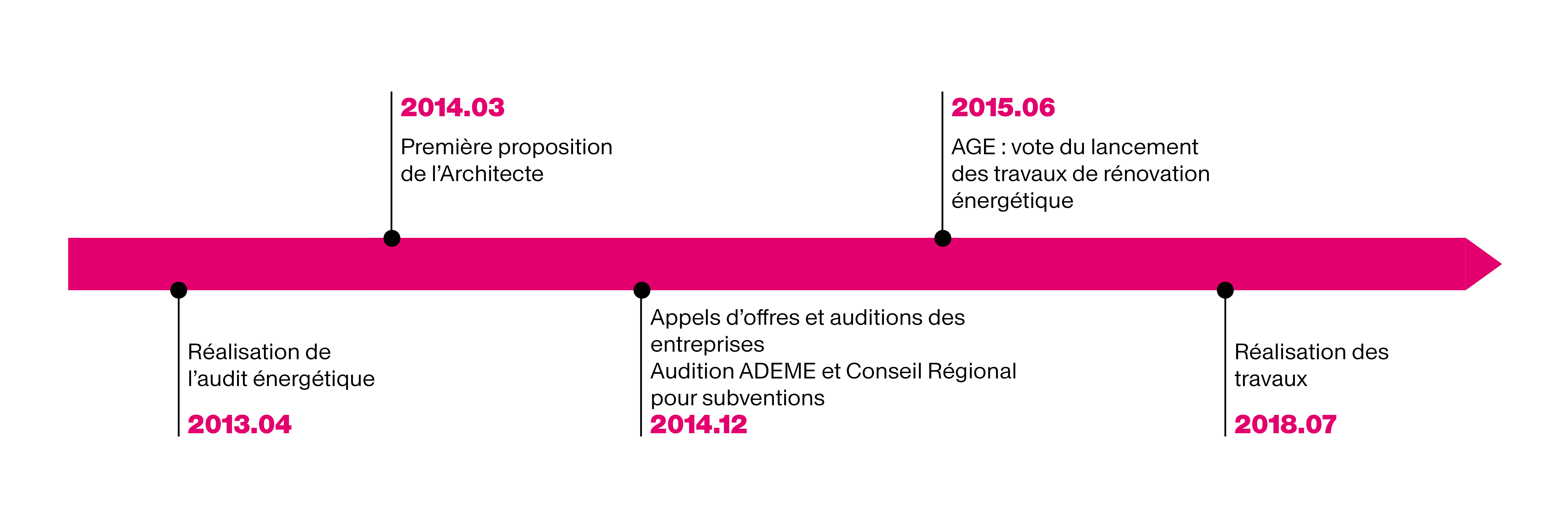 Un audit global (comprenant un volet énergétique et un volet architectural) a été réalisé à la demande de la copropriété avec pour objectif d'amener la performance énergétique à un niveau très ambitieux tout en revalorisant l'image de l'immeuble en conservant l'intention architecturale de départ. La rénovation énergétique est donc l’occasion d’une réelle revalorisation architecturale, les matériaux et couleurs de la nouvelle façade constituant une nouvelle image, ce qui était une forte demande des copropriétaire.