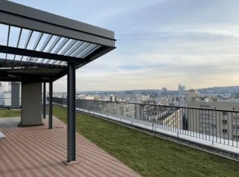 - La toiture-terrasse est végétalisée et un espace paysager et partagé est envisagé. La végétalisation permet d’améliorer l’isolation, de préserver l’étanchéité de la toiture-terrasse du rayonnement solaire et des écarts thermiques importants.