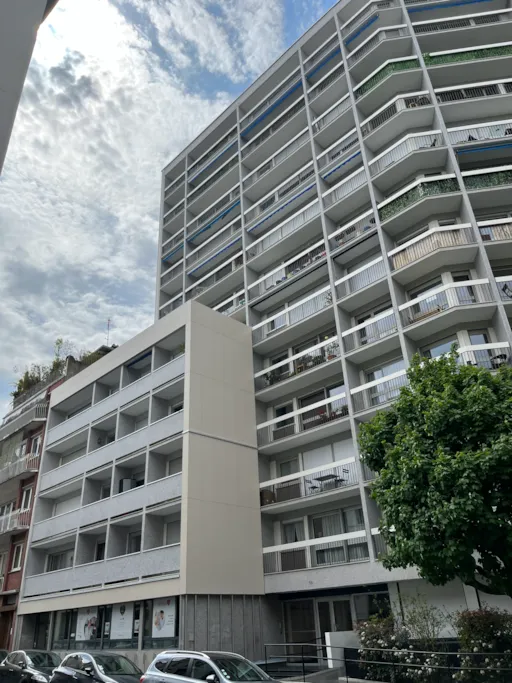 L'isolation des fonds de loggias a permis d'améliorer considérablement le confort d'été des occupants de ce pignon exposé plein ouest. Les étages 2, 3, 4 et 5 bénéficient d'un isolant en mousse résolique particulièrement adapté aux murs de loggias ; avec une épaisseur de 9 mm il limite au maximum la perte d'espace. Grâce à l'installation de doubles vitrages, les nuisances sonores côté rue ont presque disparu.