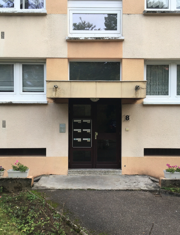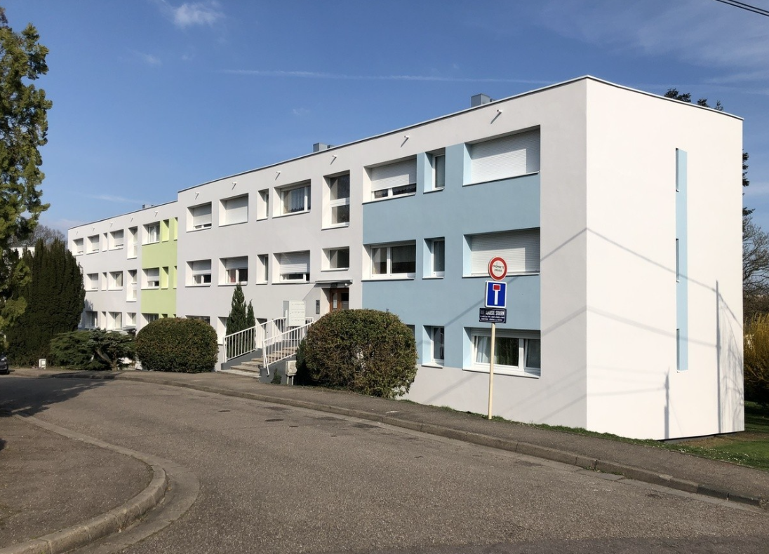 Pour chaque façade et par entrée d’immeuble, un grand carré d’enduit coloré a été réalisé, de manière à renforcer l’identité de chaque entrée tout en donnant du caractère à ces nouvelles façades lisses en procédant à un changement d’échelle. Les fenêtres sont regroupées par blocs distincts et sur les trois niveaux habités. Chaque appartement bénéficie ainsi d’un ensemble de fenêtres intégré dans l’un de ces grands carrés (à l’avant ou à l’arrière).