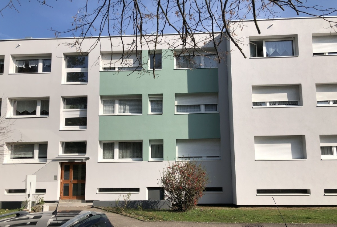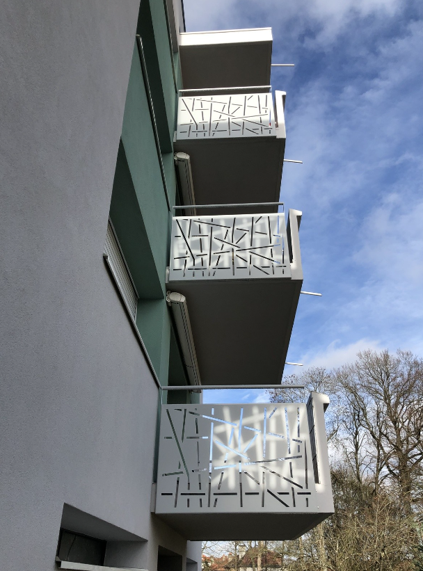 Les fenêtres des salles de bains des pignons, très étroites, sont regroupées par trois et participent à la composition de ces façades pignons, ainsi qu’à la lisibilité de l’ensemble. Les teintes envisagées pour ces grands pans d’enduit sont un camaïeu de bleu-vert et de différents verts, rappelant les couleurs estivales de la végétation environnante et participant ainsi à l’intégration de l’ensemble immobilier dans son contexte paysager. Le remplacement nécessaire des garde-corps des balcons a été l’occasion de disposer des garde-corps “à l’anglaise”, c’est-à-dire recouvrant le nez-de dalle du balcon considéré, évitant ainsi une coûteuse remise en état. Ils ont été réalisés en tôle perforée, permettant d’améliorer sensiblement l’esthétique de la façade arrière (plus de nécessité de “canisses” ou d'autres systèmes d’occultation disgracieux).