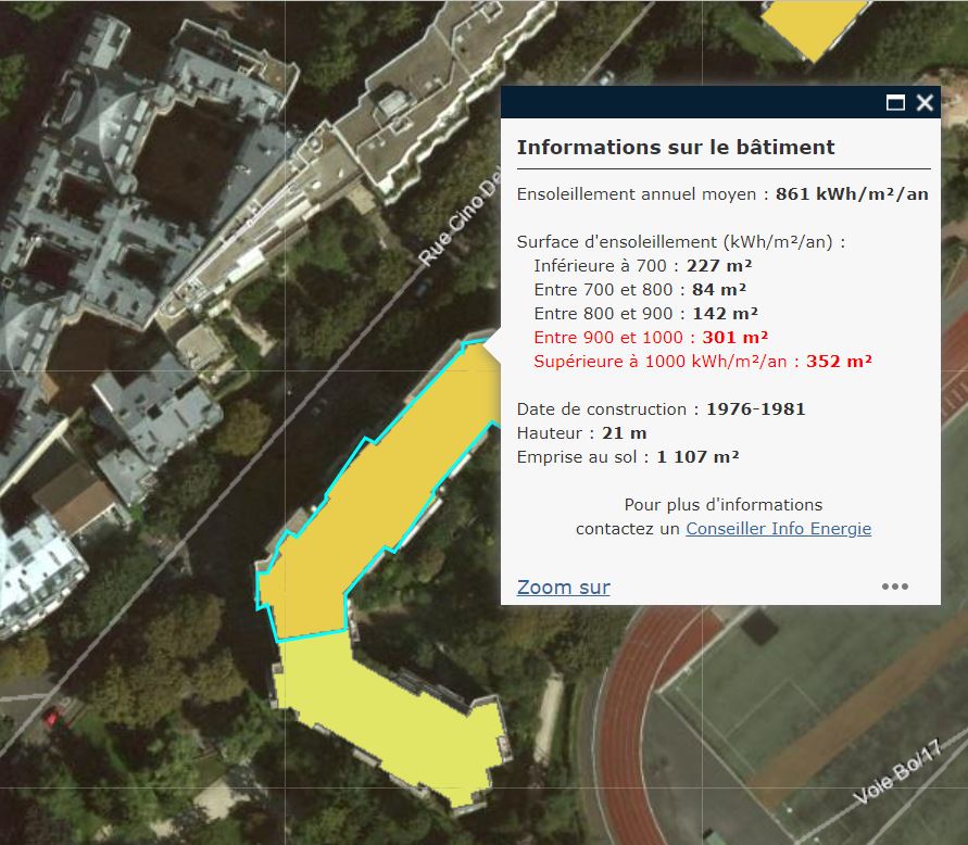 Le cadastre solaire de Paris permet de connaître l'ensoleillement des terrasses ainsi que la production maximale qu'il serait possible de faire. D'après cet outil, sur une des terrasses de la copropriété, une surface de 352m² possède un ensoleillement maximal supérieur à 1000 kwh/m²/an. cette terrasse est donc particulièrement bien exposée. Cependant, le référent énergie de la copropriété rappelle la présence d'ombres, de tuyaux etc. qui impliquent que la surface réellement disponible est inférieure à celle que l'on a sur le cadastre. Ci-dessous les informations que l'on trouve pour le 21 rue Cino Del Duca.
