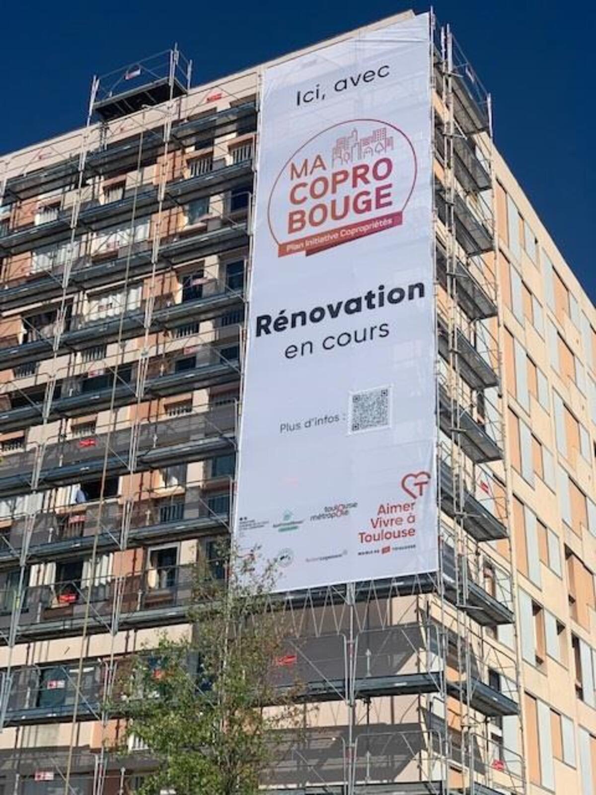 Pour sensibiliser les passants à la rénovation de cette résidence, un grand affichage a été mise en place sur l'échafaudage.