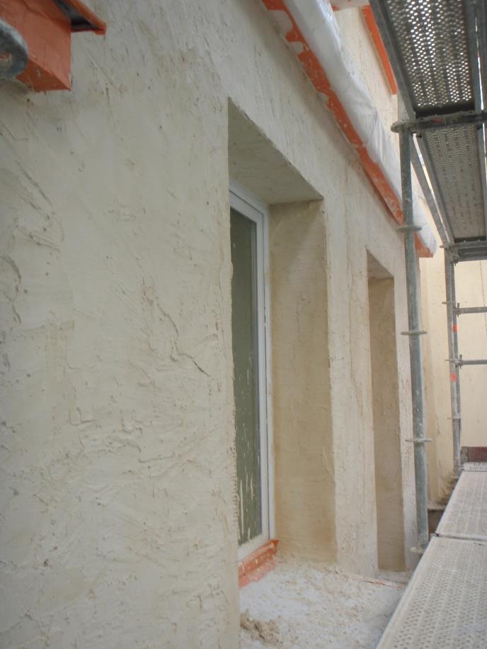 Le choix des isolants a fait l’objet d’une attention particulière : un enduit chaux-chanvre projeté a permis d’isoler les murs extérieurs, et la ouate de cellulose (papier journal recyclé) a été utilisée pour les combles. Ces deux isolants ont la caractéristique d’être perspirants (ce qui favorise les transferts d’humidité) et d’être biosourcés.*