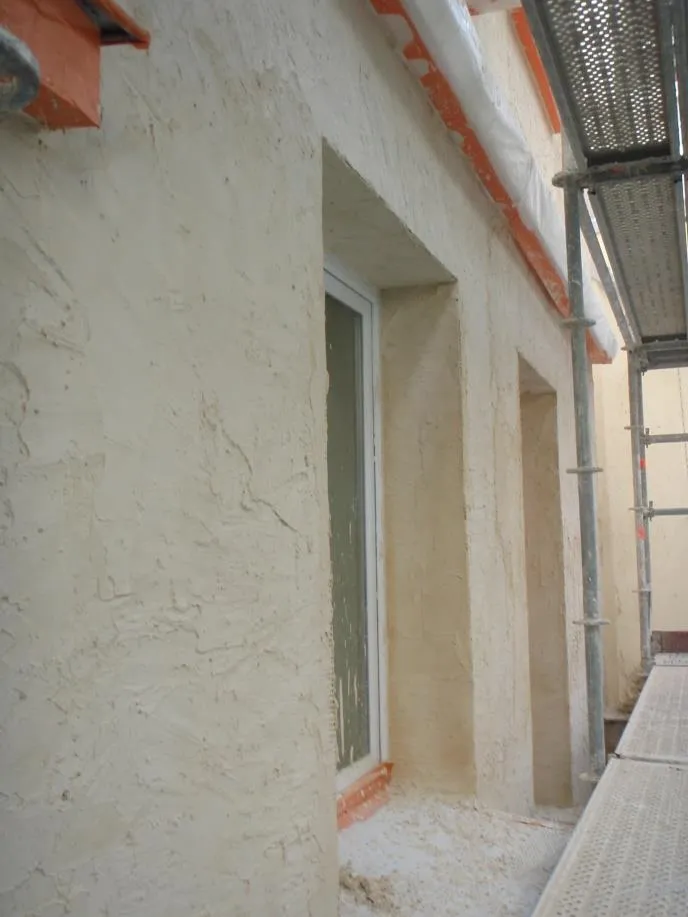 Ce projet de rénovation énergétique s’est concentré sur les façades cour, orientées nord. Au vu des nombreuses qualités architecturales et la richesse des modénatures de la façade, la solution retenue ne pouvait être trop invasive. Les travaux se sont orientés vers une Isolation Thermique par l’Extérieur en chaux-chanvre de 8cm d’épaisseur, représentant une résistance thermique de 0,95m².K/W. Les combles perdus ont également été isolés en ouate de cellulose de 30cm d’épaisseur.