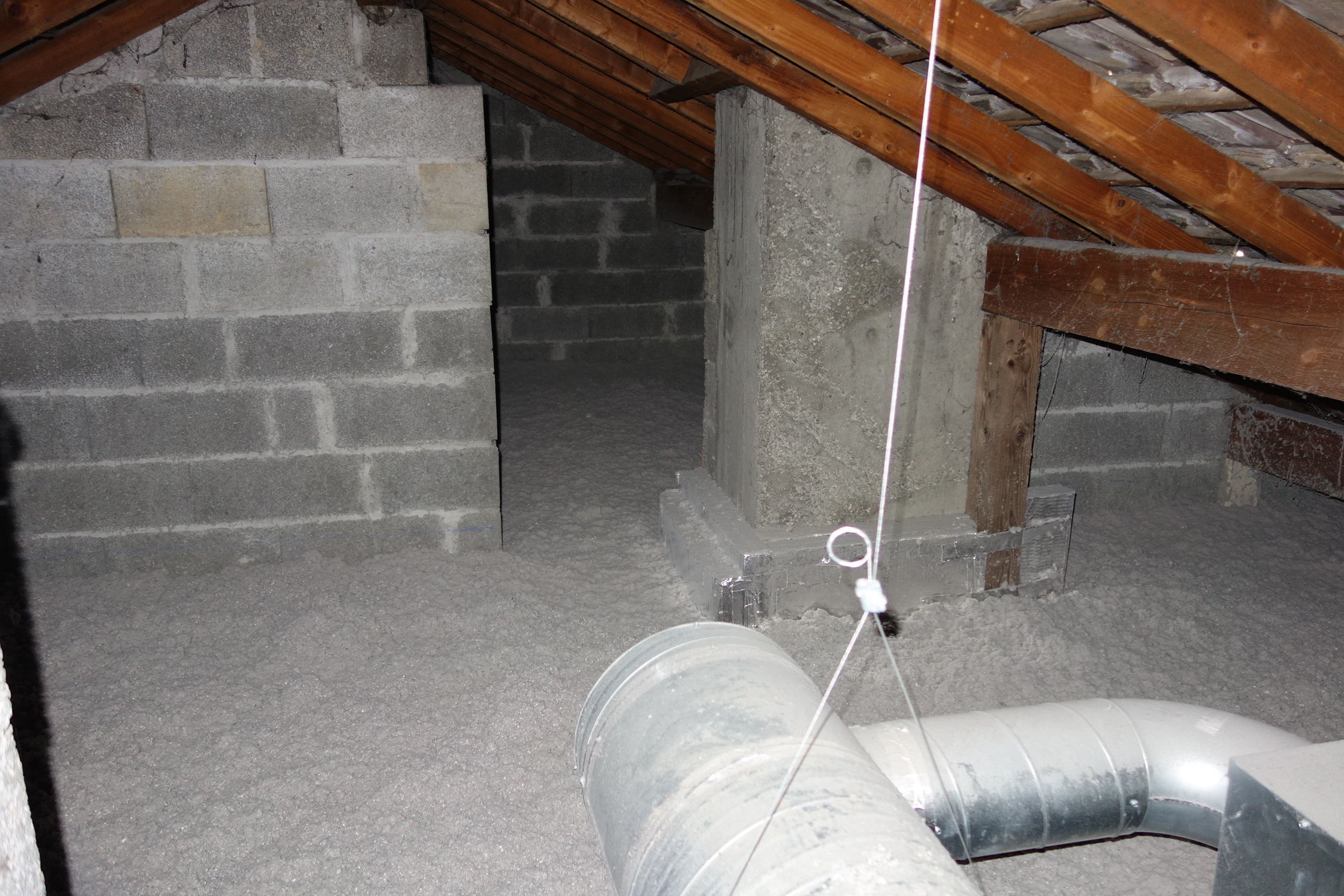 Après dépose de la laine de verre existante, nouvelle isolation avec 40,5 cm - 32 cm après tassement de ouate de cellulose.