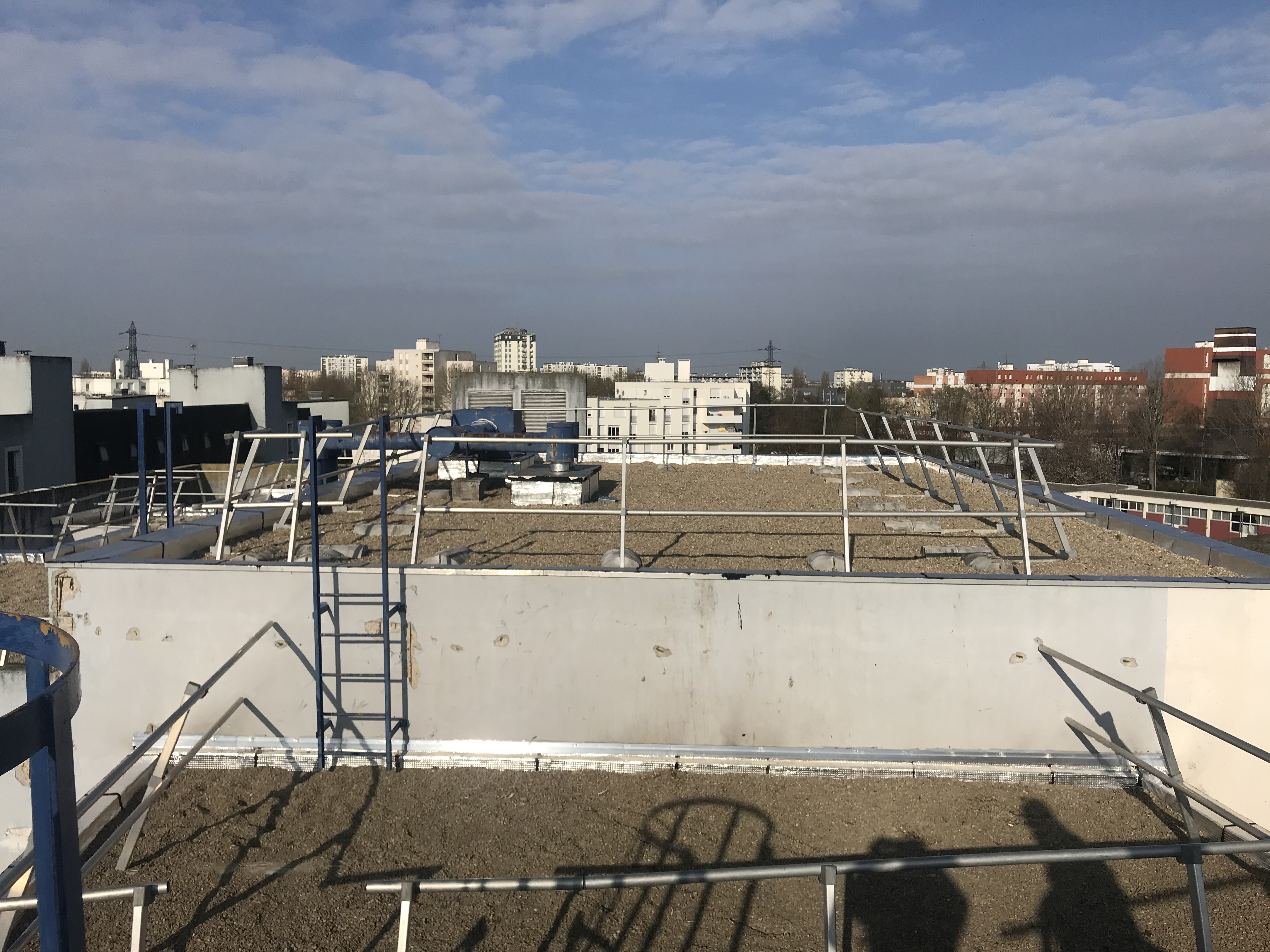 Etat de la toiture terrasse après réfection de l'étanchéité et isolation par panneaux polyuréthane. | Etat final de la copropriété après rénovation, depuis l'avenue Youri Gagarine. On remarque les modifications de teintes apportées par les niveaux de gris, inexistants à l'origine, rendant le bâtiment plus moderne. |