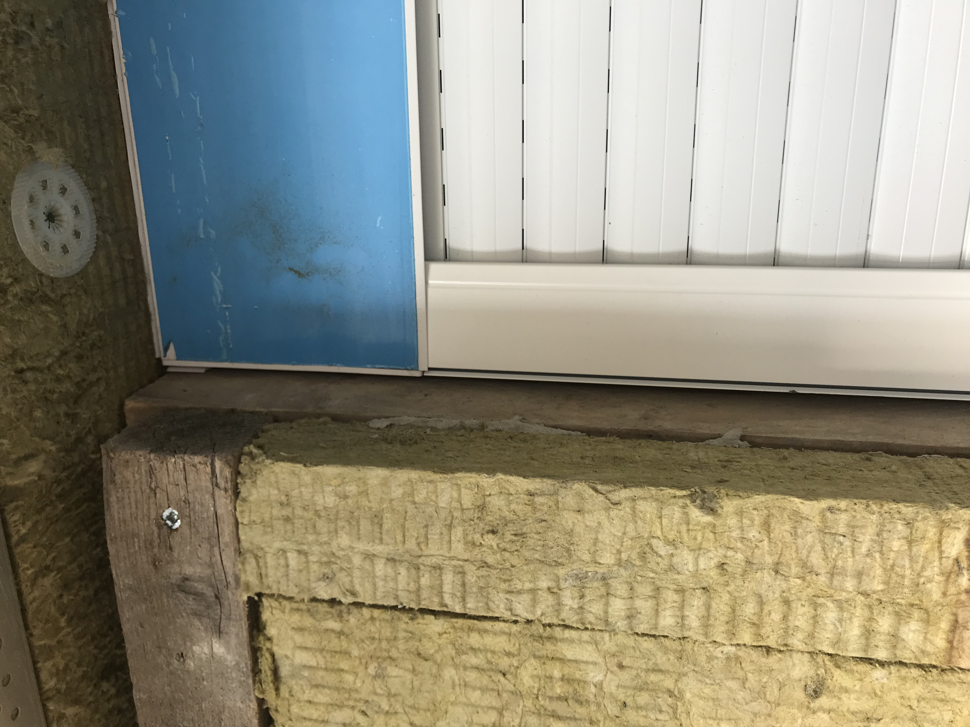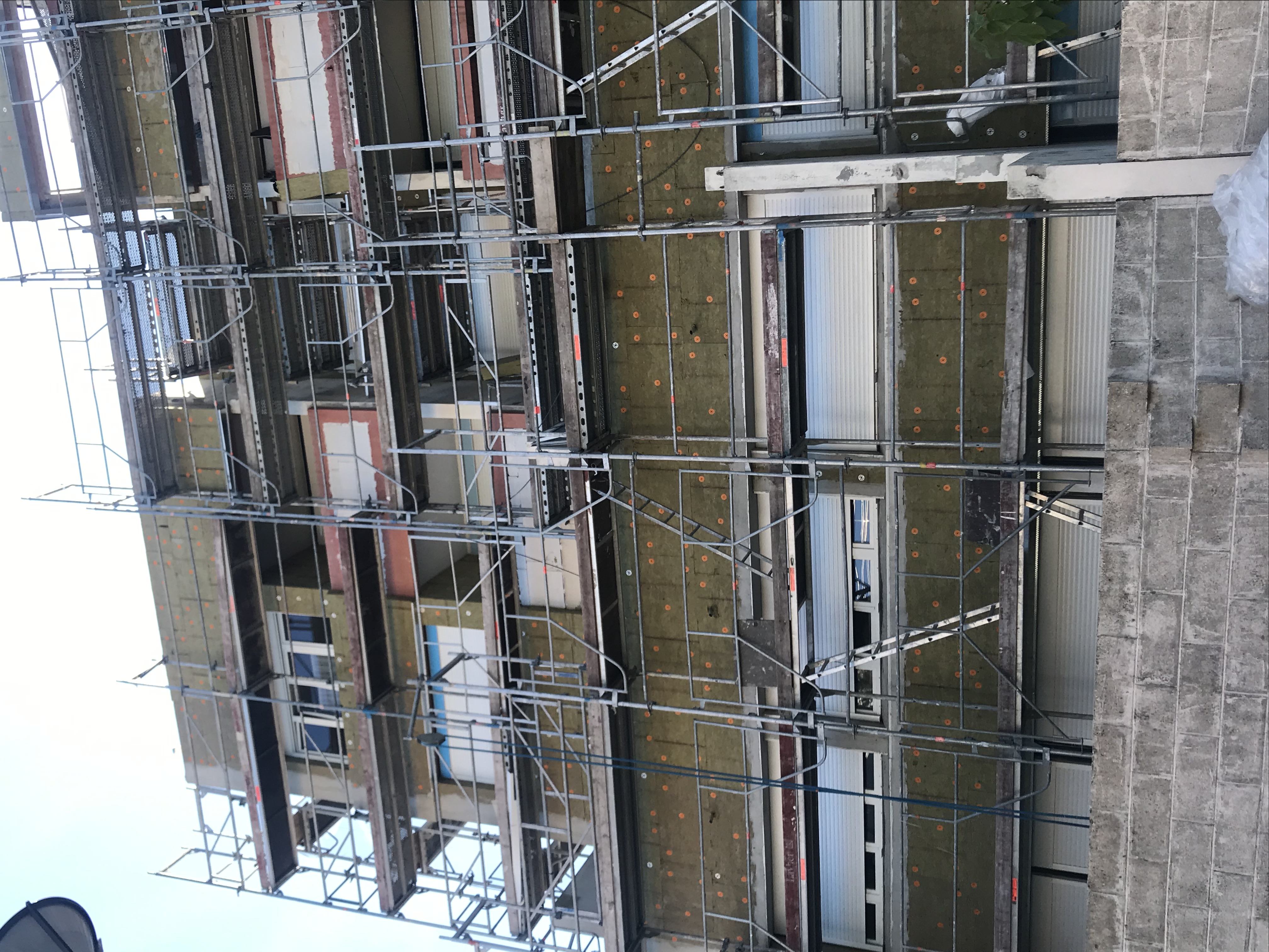 Pose en cours des panneaux de laine de roche en collé-chevillé sur la façade du bâtiment. | Isolation en cours des contours de baies vitrés par les panneaux de laine de roche. |