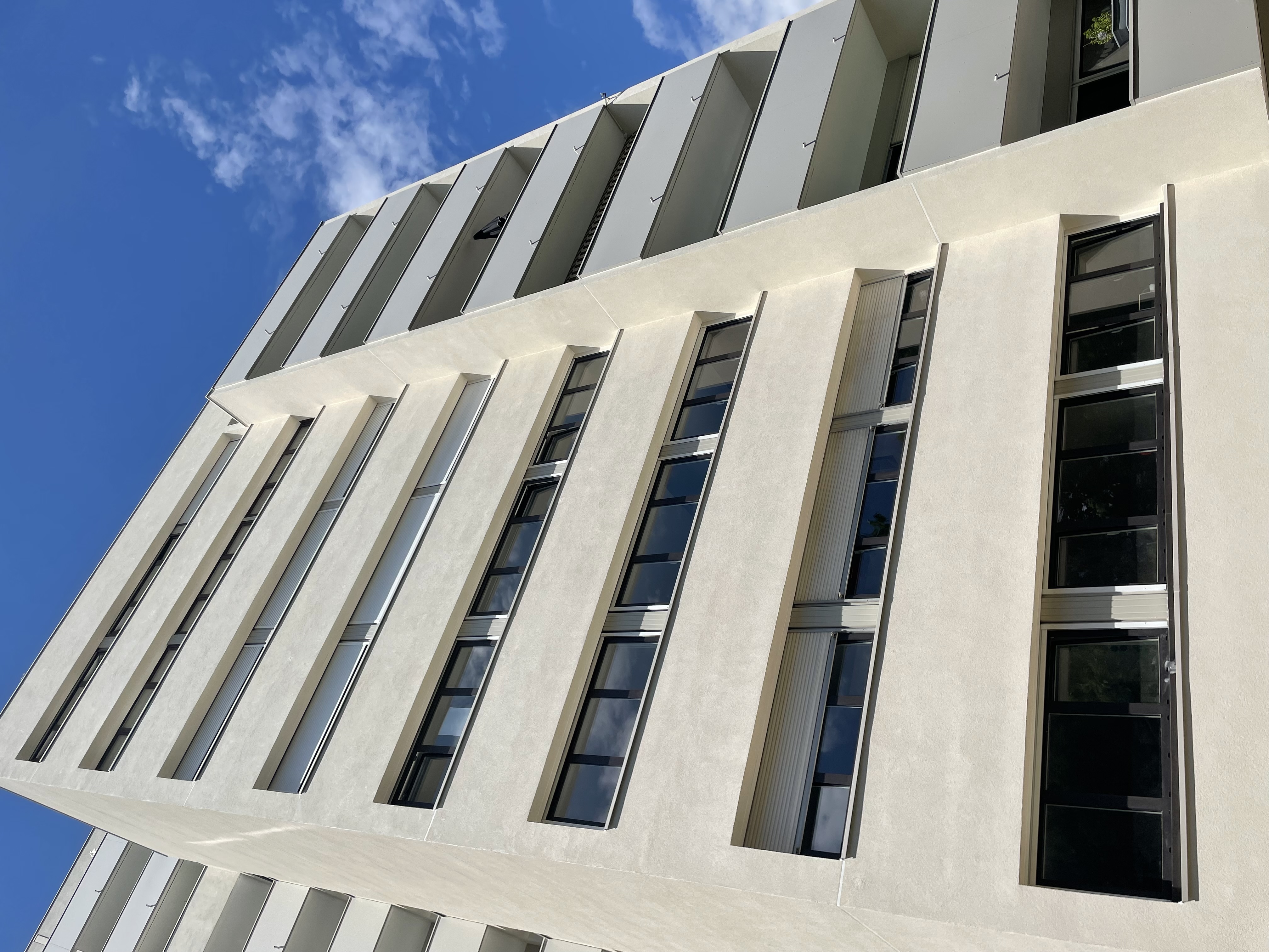 Les façades sont composées de volumes pleins et vides, créant une dynamique dans la lectures des volumes.