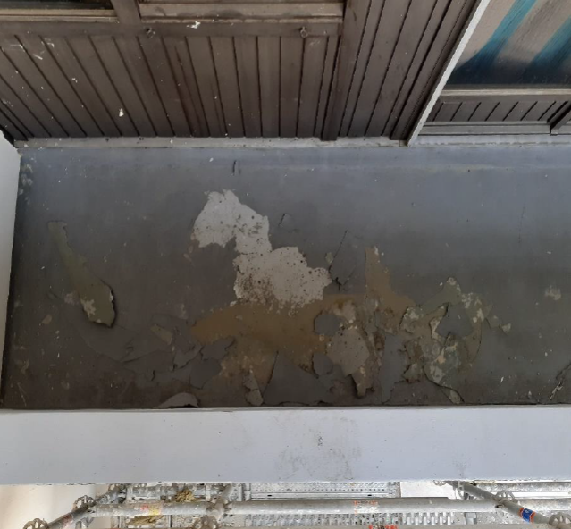 - Eclatement du béton armé, infiltrations et fissures au niveau des façades, présence d'amiante.