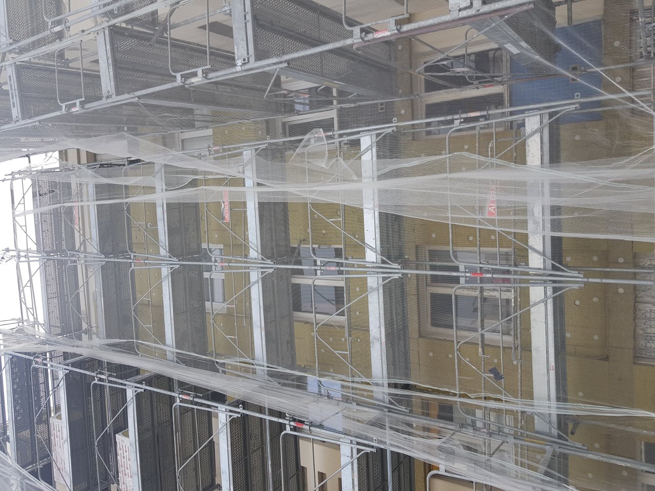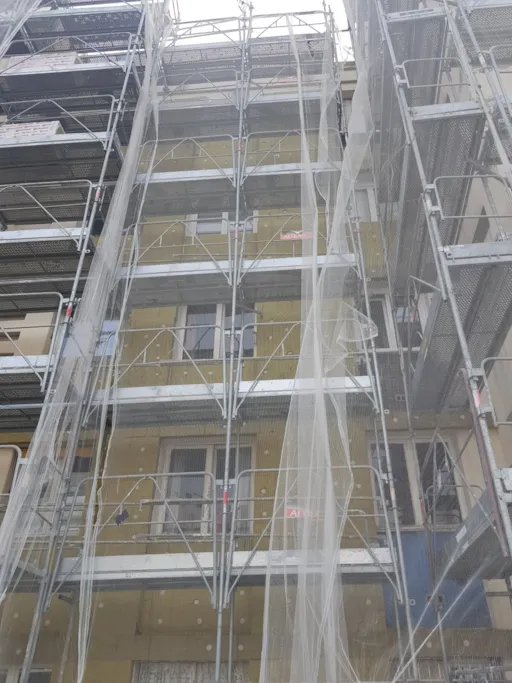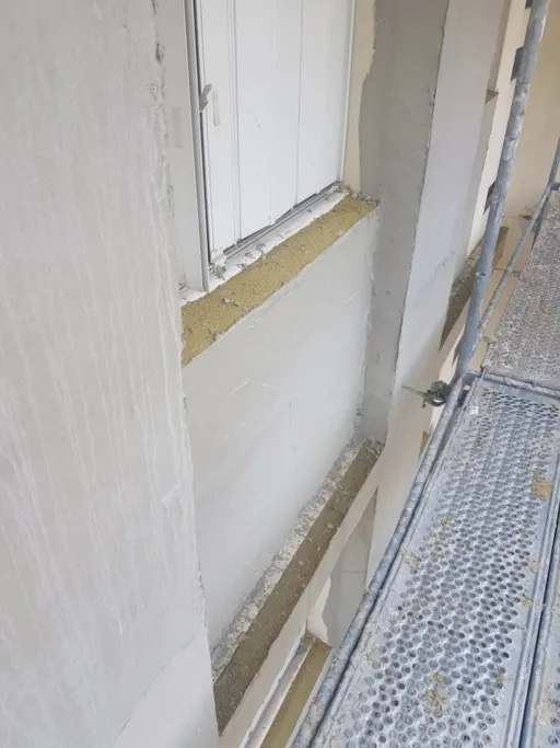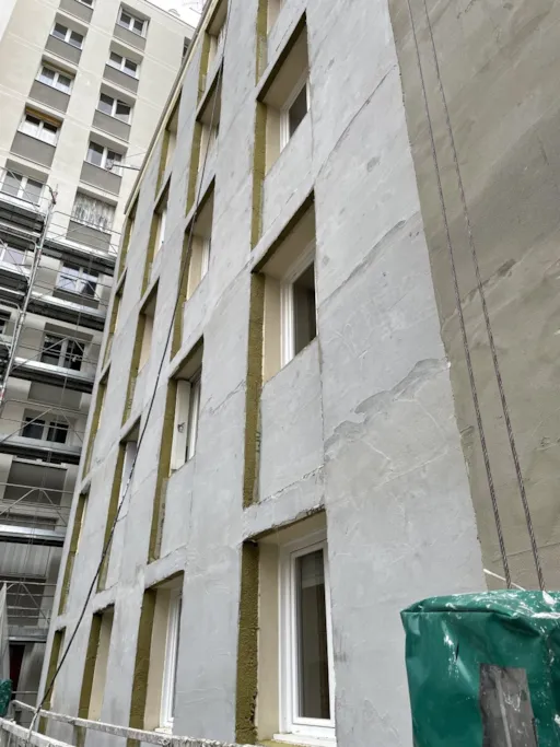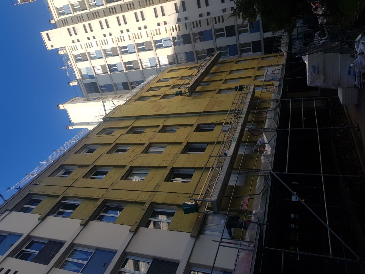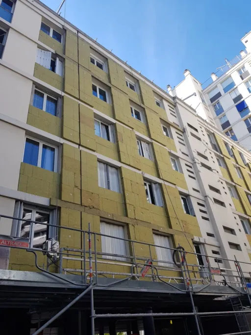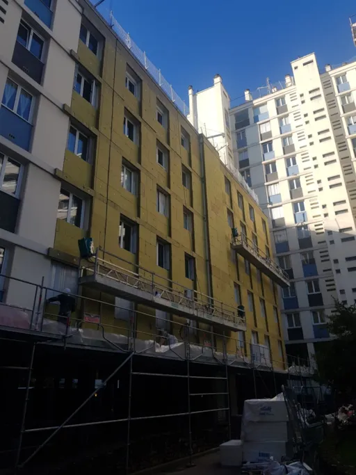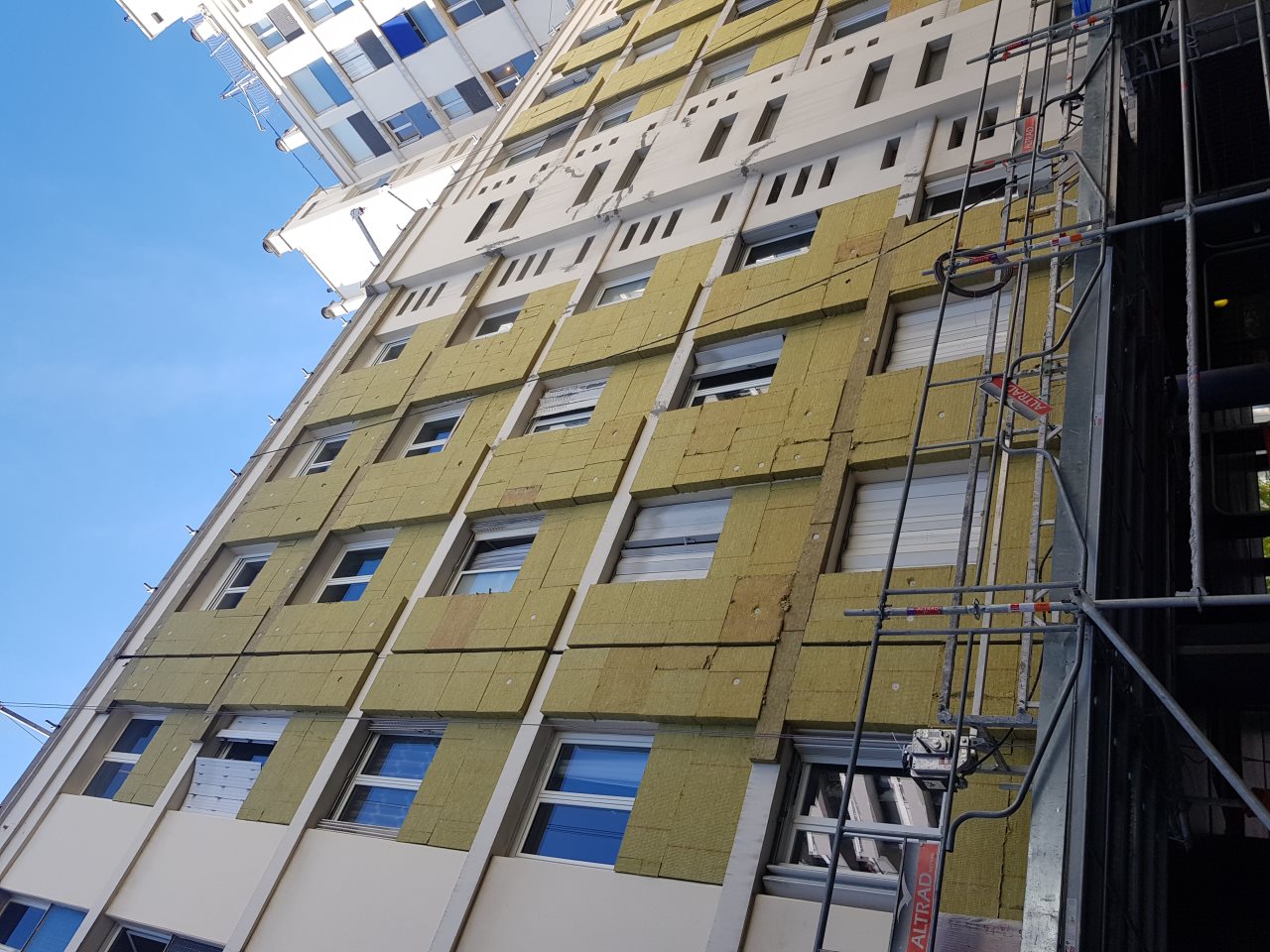 - Isolation par l'extérieur (ITE) de toutes les façades et des pignons, soit environ 5800m², en laine de roche.