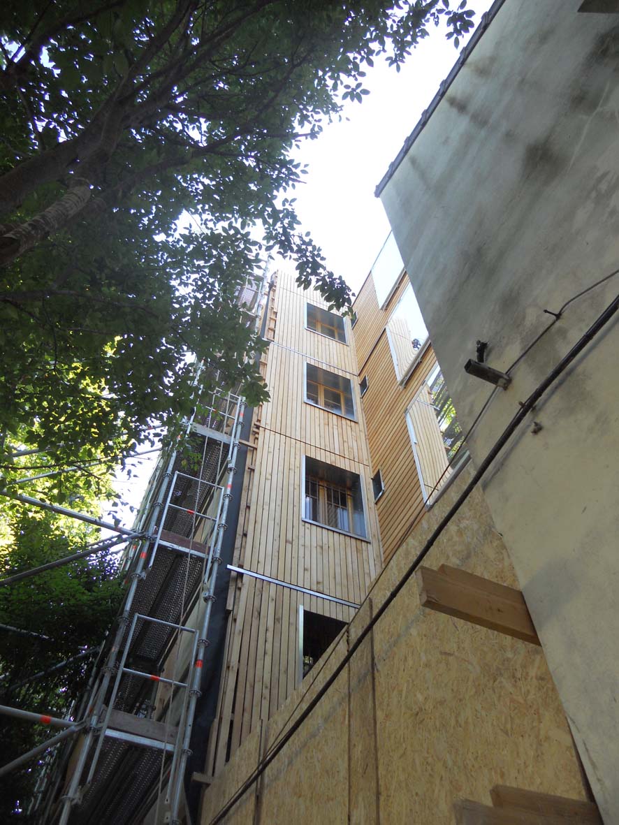 Isolation par l'extérieure de la façade Nord-Ouest et la cage d'escalier - finition bardage bois.