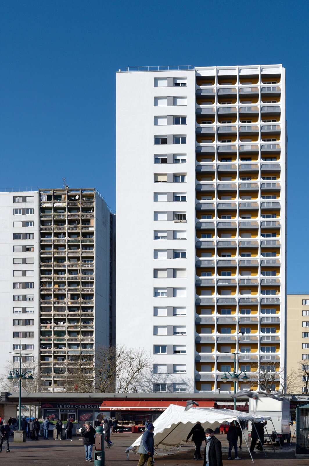 Il s’agit d’une tour R+17 sur la place de la mairie du Val Fourré, construite dans les années 70 et visible de toute part. Notre démarche architecturale pour sa rénovation énergétique a été de s’appuyer sur l’ADN du bâtiment afin d’en faire ressortir les éléments forts et d’atténuer ceux qu’il faudrait gommer. Nous avons simplifié l’écriture architecturale du bâtiment, en lui apportant une qualité moderne et résidentielle.