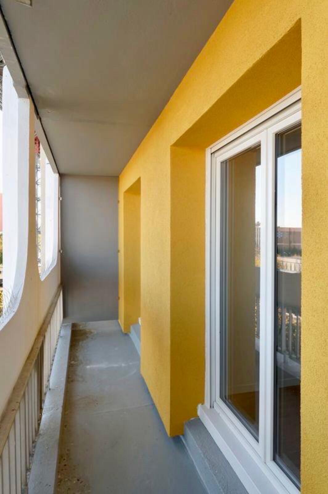 - mise en œuvre d'une couleur sur les fonds de balcons afin de redonner toute la force aux éléments préfa. Les grilles métalliques grises de remplissage occultant légèrement les garde-corps participent à faire ressortir le béton préfa blanc.