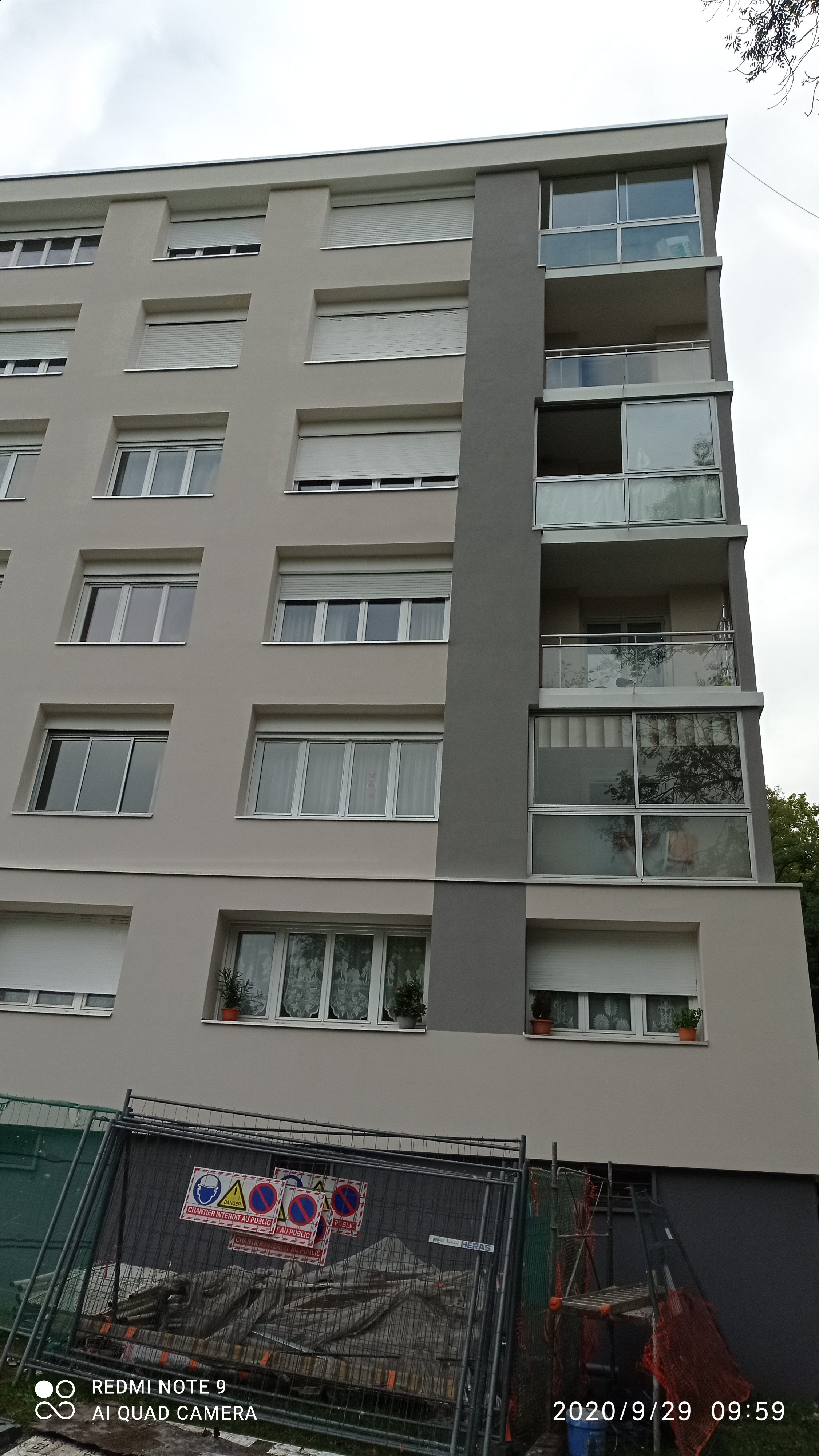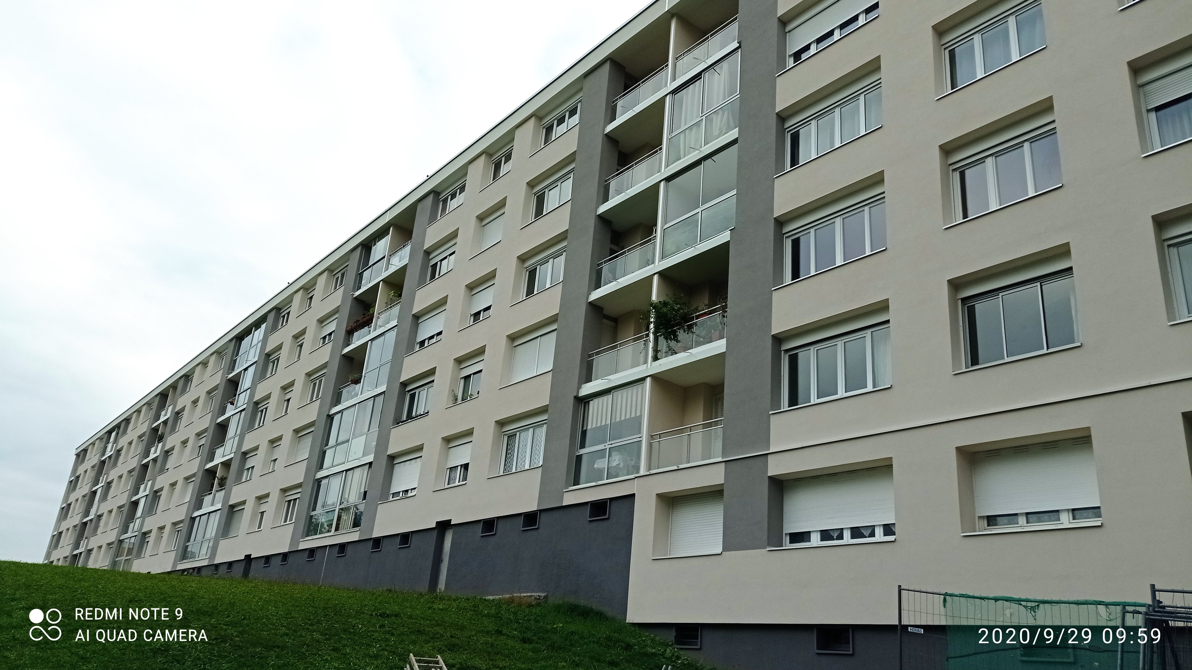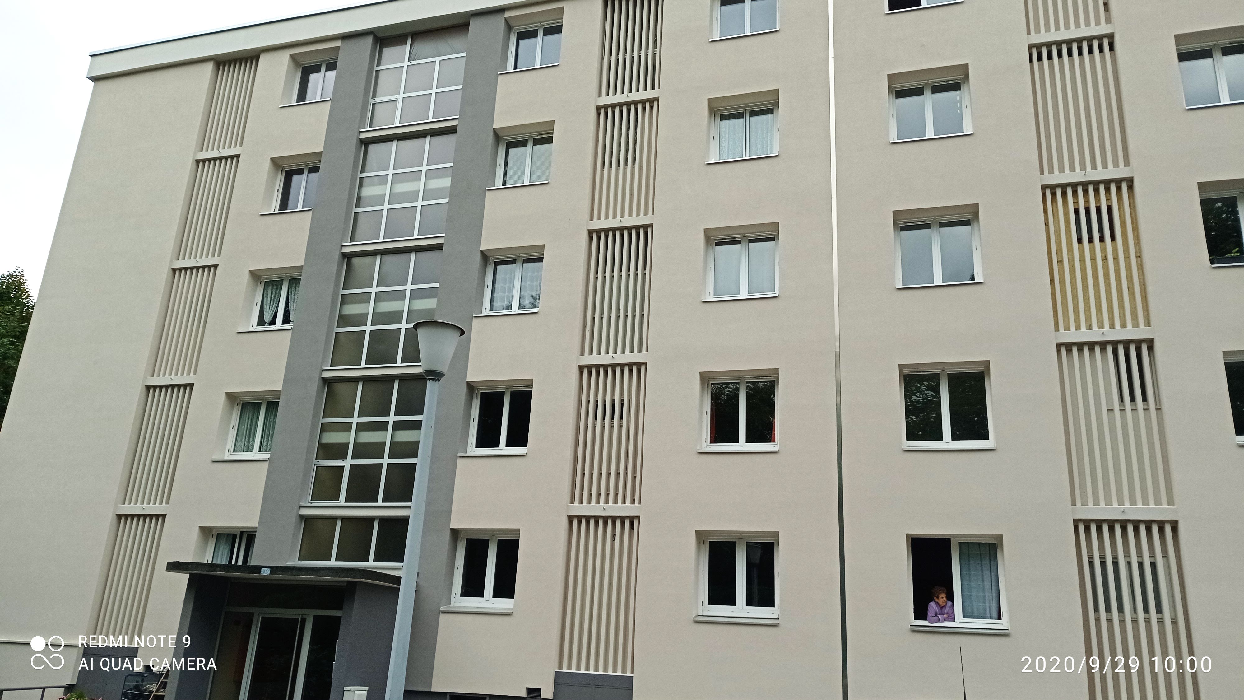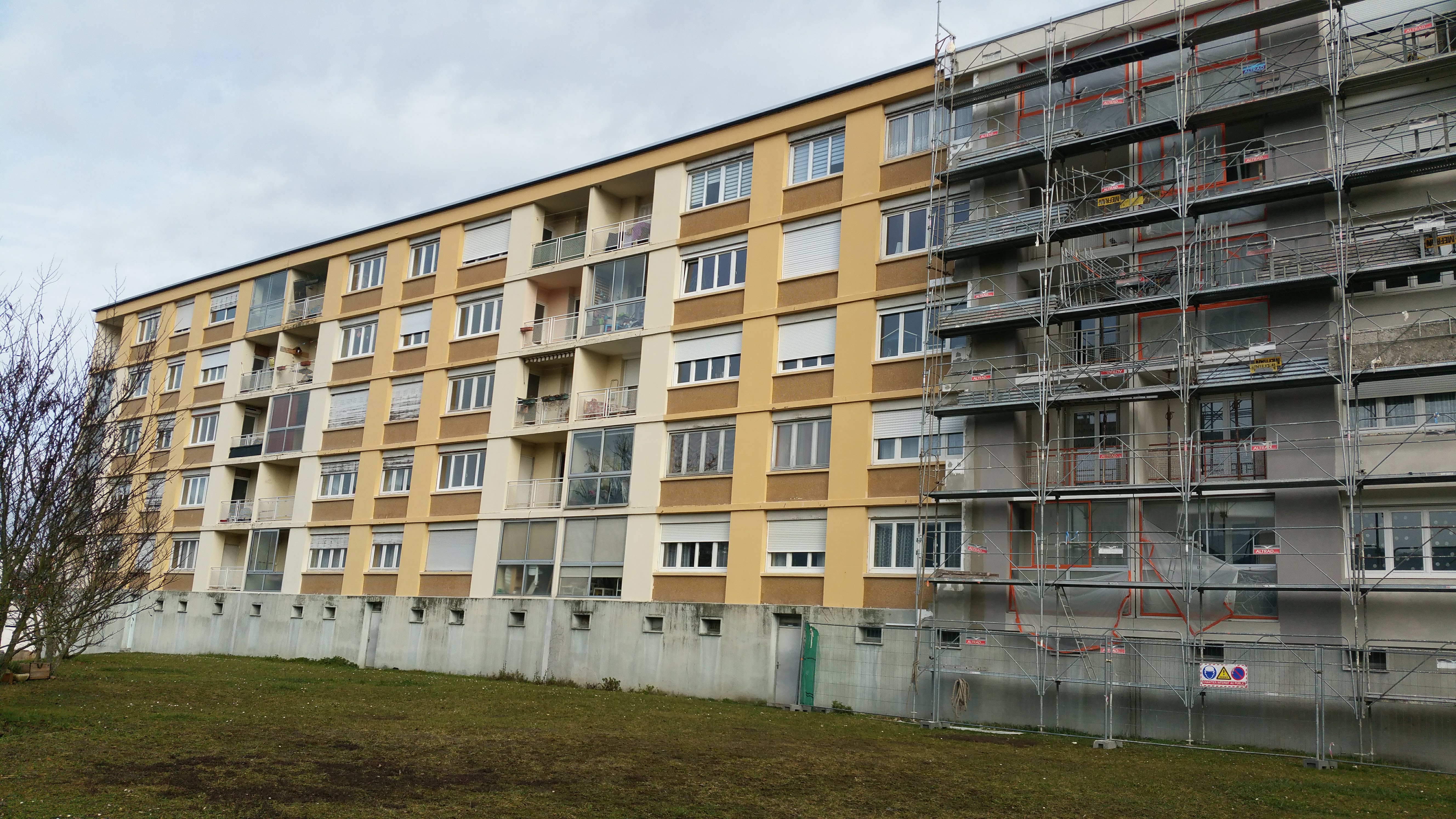 brique plâtrée ---------------------------------------------------- TRAVAUX DE RÉNOVATION : Traitement éclats de béton, épaufrures et fissures. Isolation thermique extérieure : 160 mm polystyrène sous enduit minéral, R = 4 m².K/W. Pas d’isolation des retours en tableau des ouvertures
